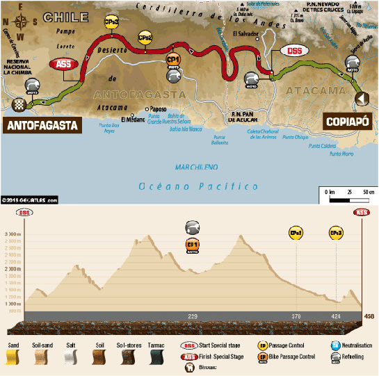 Cea de-a cincea probă specială din cadrul Raliului Dakar va avea loc joi pe un traseu competitiv de 458 de kilometri între localităţile chiliene Copiapo şi Antofagasta.