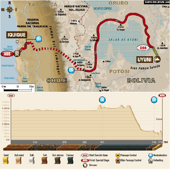 Cea de-a opta probă specială din cadrul Raliului Dakar va avea loc duminică în sens invers, concurenţii urmând astfel să revină de la Uyuni (Bolivia) la Iquique (Chile). De data aceasta, ei vor parcurge o distanţă de 784 de kilometri în ritm competitiv.
