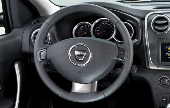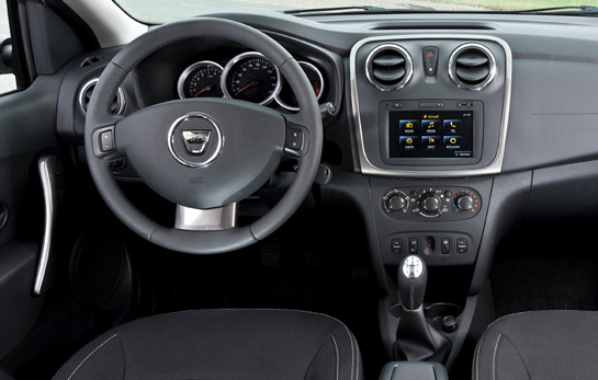 La capitolul interior, Dacia foloseşte cuvinte mari în comunicatul oficial, apariţia sintagmei "de ultimă generaţie" fiind ocazionată de montarea display-ului touch de pe Lodgy şi pe Logan şi Sandero. Chiar dacă impresia low-cost rămâne la nivel estetic şi al materialelor - detaliile subliniind plastice dure pe bord şi pe uşi - Dacia a făcut câţiva paşi pozitivi importanţi. Printre aceştia se numără apariţia unor detalii cromate pe versiunile superioare de echipare (ramele gurilor de aerisire, mânerul schimbătorului de viteze şi logo-ul Dacia de pe volan), şi a unui detaliu colorat în zona inferioară a planşei de bord, aceasta asortându-se cu mânerele uşilor.