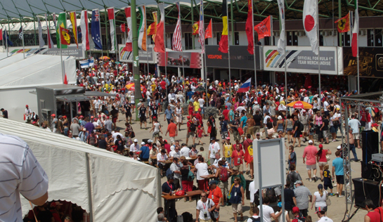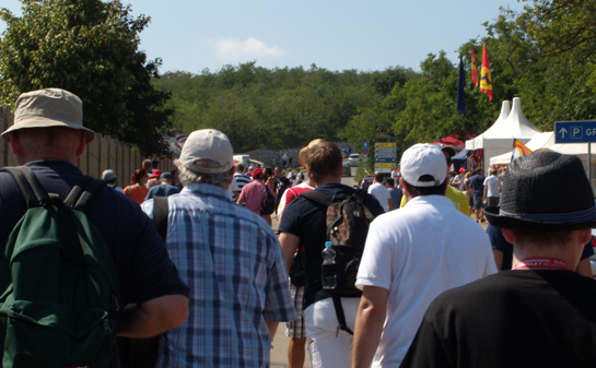Pe drum se circulă bară la bară, iar "trotuarul", în cea mai mare parte un simplu teren îngust plin de praf, este şi el aglomerat din cauza fanilor de toate vârstele care se grăbesc în "roiuri" să prindă ultima sesiune de antrenamente. Nu mă pot rătăci nici dacă aş vrea, pentru că pancartele cu drumul către fiecare tribună în parte sunt pe cât de mari, pe atât de dese.