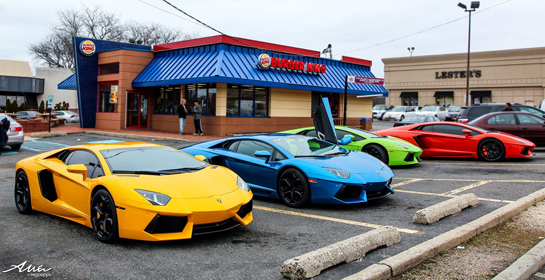 Foarte interesant este faptul că Derek Walker nu merge pe soluţiile "normale" atunci când vine vorba de imaginile pe care le produce. Astfel, dacă logica ne spune că un Bugatti Veyron ar arăta excelent în faţa unei case foarte scumpe sau a unui castel vechi, americanul gândeşte diametral opus: "Cu cât o maşină este mai rară şi mai scumpă, cu atât mai "gri" îmi place să fie locul în care o fotografiez. Ai nevoie de contrast în fotografii şi, dacă fotografiez un Bugatti, îmi place să găsesc un depozit părăsit sau o fabrică pentru a sublinia contrastul dintre subiectul imaginii şi mediul care îl înconjoară".De galeriile foto create pentru clienţii lui Lamborghini Aventador se leagă şi una dintre cele mai amuzante situaţii în care a fost pus fotograful american. Acesta se afla la o sesiune foto cu patru exemplare ale supercarului italian - "Quadventador", aşa cum a fost numită galeria ulterior. La pauza de masă, maşinile colorate strident au parcat la un restaurant Burger King apropiat. De aici s-a dezlănţuit internetul: "Aproape că am cauzat un accident atrăgând atenţia tuturor celor din jur. Iar fotografiile acelui <pit stop> au împânzit internetul şi am ajuns pe iFunny (n.r. o aplicaţie de mobil care adună cele mai amuzante fotografii de pe net), unde am avut 200.000 de like-uri", povesteşte amuzat newyorkezul. O imagine din timpul "Operaţiunii Burger King" e mai jos.