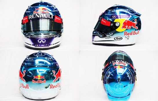 Cel puţin pentru startul sezonului, Sebastian Vettel mizează în continuare pe o cască cu diverse nuanţe de albastru, în special albastru închis, iar numărul 1 este inscripţionat pe partea superioară, dar este destul de greu lizibil.