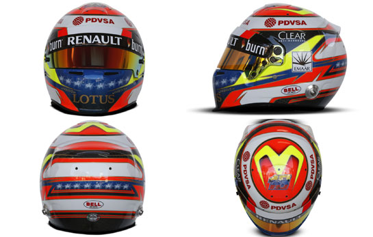 Pastor Maldonado nu iese în evidenţă doar prin numărul 13, ci şi prin desenul inscripţionat pe partea superioară a unei căşti care abundă în portocaliu aprins, alb sau negru.