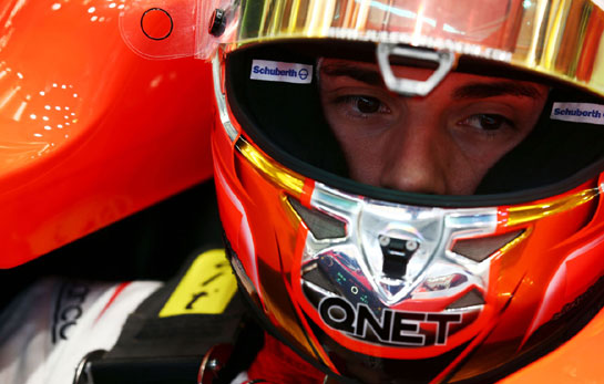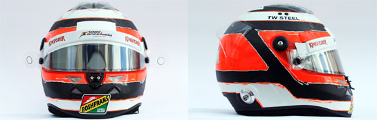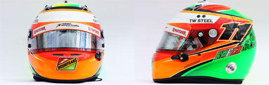 Revenit la Force India după un sezon petrecut la Sauber, Nico Hulkenberg are o cască cu roşu, negru şi alb, iar numărul 27 este vizibil pe partea superioară.