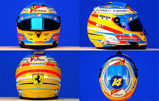 Fernando Alonso rămâne fidel albastrului deschis utilizat în ultimii ani, cu mici inserţii de roşu ca urmare a apartenenţei de Scuderia Ferrari.