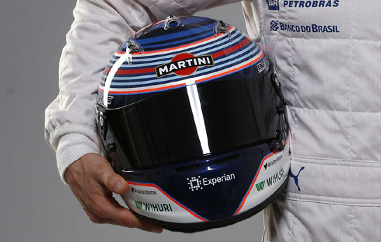 Valtteri Bottas a adoptat un stil mai sobru pentru casca sezonului 2014, cu alb în partea inferioară, celebrele dungi Martini amplasate deasupra vizorului şi albastrul de pe partea superioară.