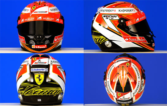 La revenirea la Ferrari după o absenţă de cinci ani, Kimi Raikkonen mizează în special pe roşu, cu mici inserţii albe.