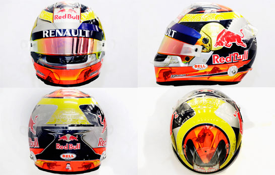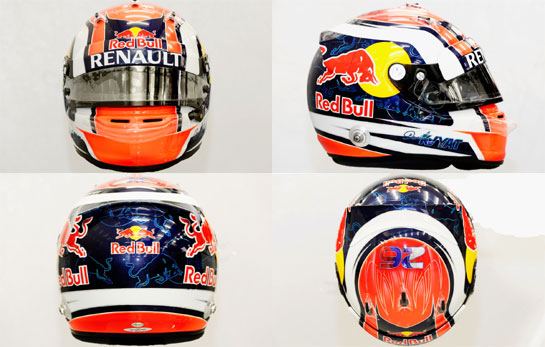 Jean-Eric Vergne a folosit deja două tipuri de căşti în teste, iar cea mai recentă dintre ele este bogată în culori: albastru, negru, galben şi chiar roşu, plus logo-ul Red Bull.
