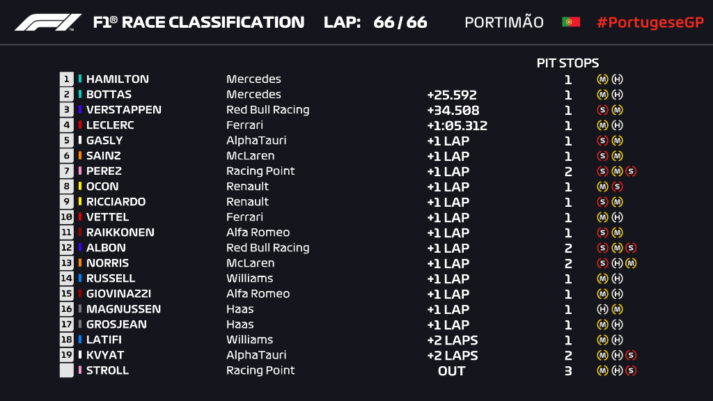 De aici, britanicul a avut de îndeplinit o simplă formalitate și și-a construit un avans liniștitor în fața lui Bottas, care nu a reușit să țină pasul. Astfel, Hamilton a trecut primul linia de sosire cu un avans de 25 de secunde în fața lui Bottas și, cu această ocazie, a obținut victoria cu numărul 92 în Formula 1. Hamilton a depășit recordul de victorii deținut de Michael Schumaher.