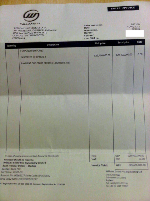 Iată şi factura plătită de PDVSA în conturile Williams pentru sezonul 2012: