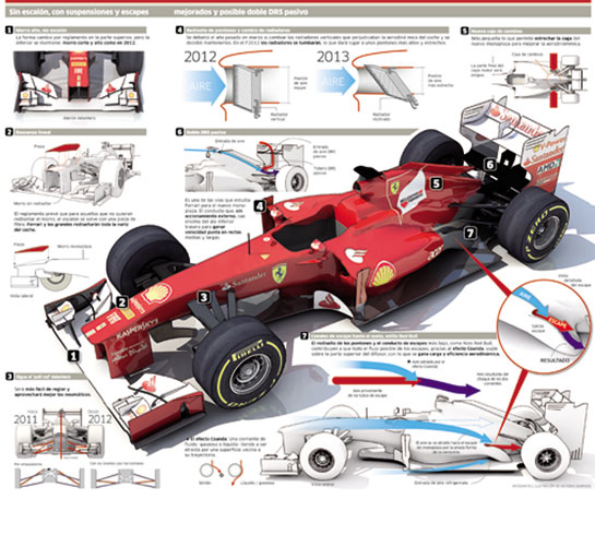 Marca afirmă de asemenea că Ferrari va aduce modificări majore la plăcile exterioare le caroseriei, care vor fi mai mici, urmând să folosească şi un sistem de evacuare de tip Coandă asemănător cu cel dezvoltat de Red Bull. În schimb, la fel ca şi anul trecut, este foarte probabil ca ferrari să folosească la evenimentul de lansare al noului monopost aripile fata şi spate de anul trecut.