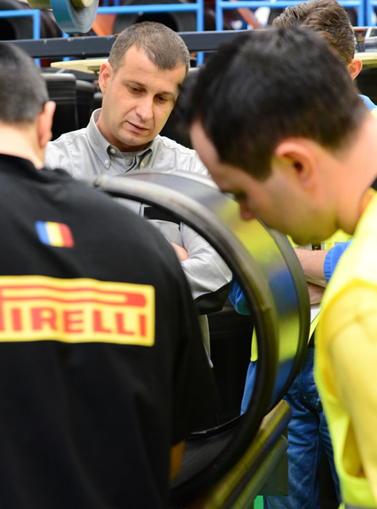 “Începând din 2012, pneurile de GP2 sunt produse la Slatina. Aşa cum probabil ştiţi, GP2 este competiţia secundară Formulei 1, iar în acest an există cinci piloţi care au ajuns în Formula 1 şi care anul trecut au concurat în GP2 cu pneuri produse la Slatina. Suntem încântaţi că anul trecut am avut zero defecte la pneurile produse pentru GP2”, ne spune Hembery.Sub indrumuarea unui român care lucrează în departamentul de producţie, avem oportunitatea de a vedea cum se realizează prima fază a construcţiei unui pneu de GP2: fâşiile de cauciuc se aplică simetric pe ceea ce va deveni structura de bază a cauciucului, apoi acestea se taie la un anumit unghi.