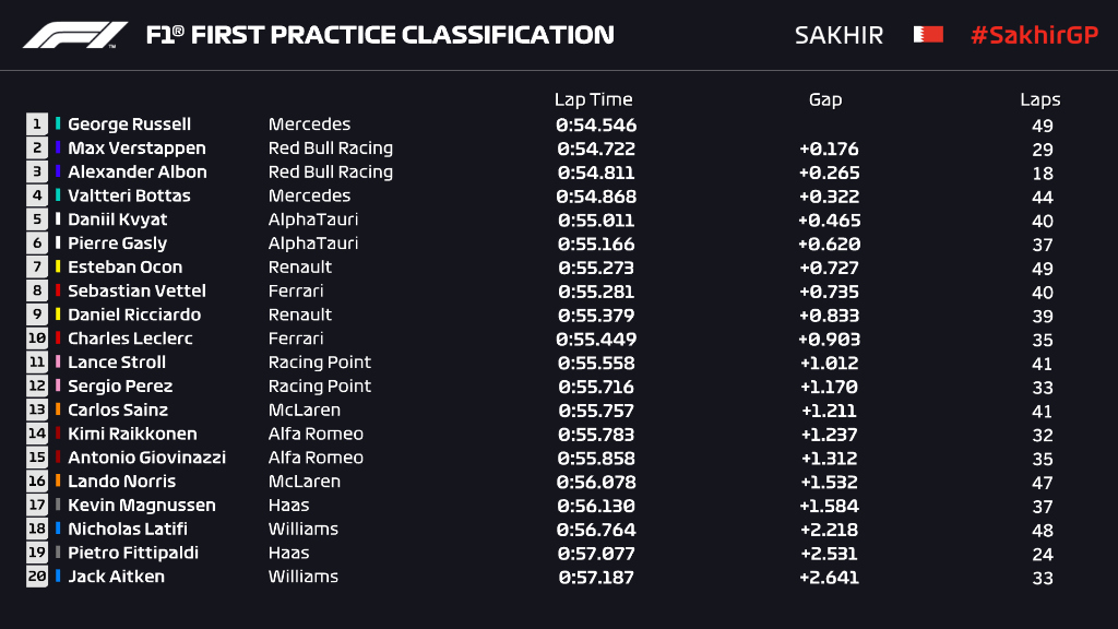 Iar Russell nu i-a luat doar locul în cockpit, ci a oferit și două mostre de performanță după ce a fost cel mai rapid în ambele sesiuni de antrenamente de vineri. Mai întâi, Russell a fost cronometrat cu 54.546 în prima sesiune, pentru ca în a doua sesiune să fie ușor mai lent, cu 54.713. Chiar și așa, el și-a surclasat toți rivalii.