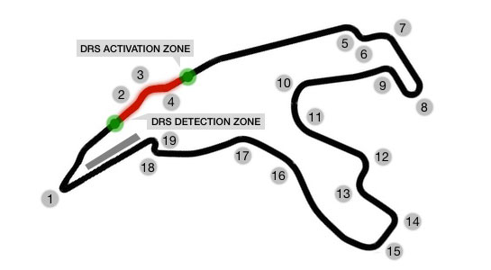 În schimb, pe parcursul cursei de duminică, sistemul DRS va putea fi activat pe cea mai lungă linie dreaptă a circuitului, situată între virajele patru şi cinci. Activarea începe la 270 de metri după intrarea în virajul patru, iar sistemul poate fi menţinut activ până în momentul frânarii pentru intrarea în virajul cinci.