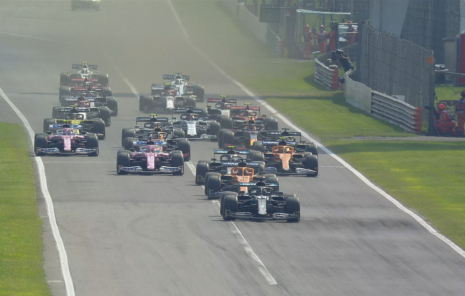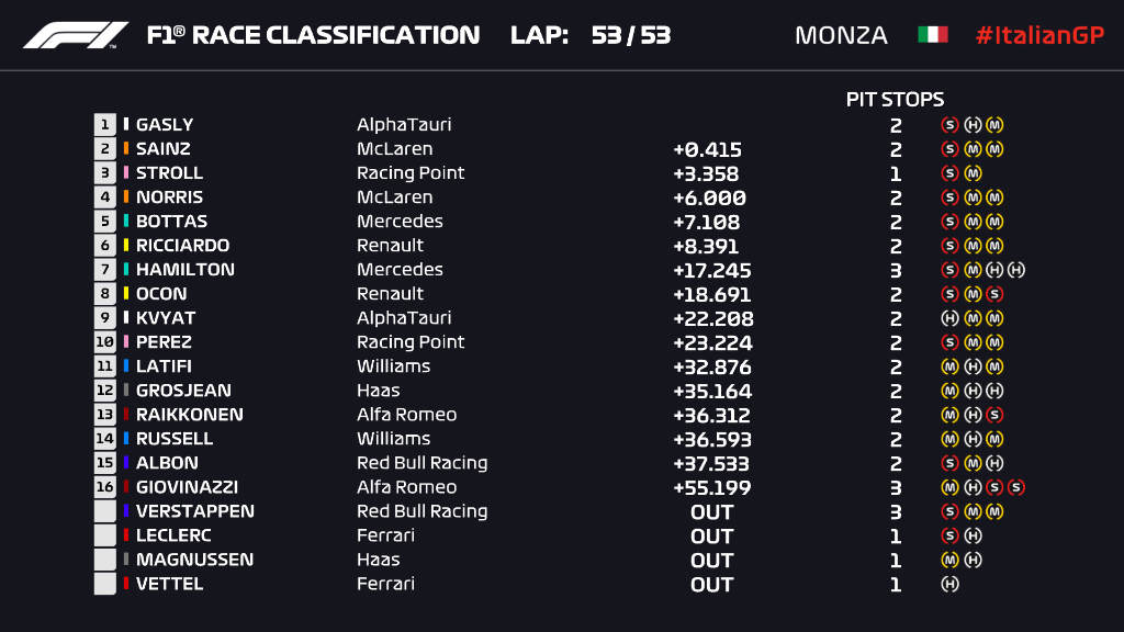 Marele Premiu al Italiei se îndrepta spre o nouă dominație a lui Lewis Hamilton, însă o întrerupe a cursei prin steag roșu după abandonul lui Charles Lerclec și o greșeală a pilotului Mercedes la intrarea de la boxe au bulversat complet clasamentul și au propulsat McLaren, AlphaTauri și Racing Point pe primele poziții.