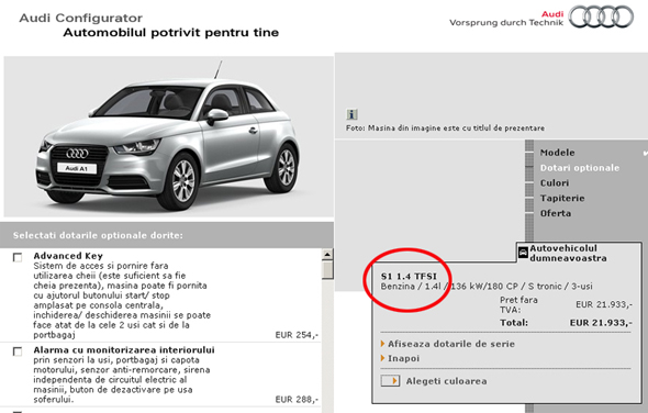 Audi a publicat pe site-ul intern preţurile oficiale pentru România ale celei mai puternice versiuni a A1. Modelul de 185 de cai putere poate fi achiziţionat în România de la un preţ 21.933 de euro fără TVA sau de 27.197 de euro cu TVA inclus.