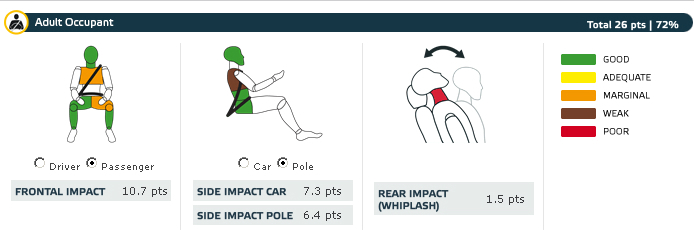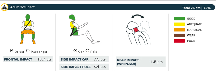 La testul de impact frontal, montantul A a fost deformat sever la nivelul părţii superioare a parbrizului, iar plafonul a fost îndoit în dreptul montantului B. Podeaua pasagerilor din spate a fost separată complet de tunelul central, iar ruptura s-a extins înspre podeaua din dreptul pasagerilor din faţă. Aceste elemente au dus la penalizarea compartimentului destinat pasagerilor pentru instabilitate în caz de accident. Datele furnizate de manechinele de test au relevat faptul că protecţia cutiei toracice este "marginală", iar bordul prezintă risc de accidentare la nivelul genunchilor şi femurului pentru pasagerii din faţă. Protecţia picioarelor şoferului şi a gleznelor şoferului este marginală, din cauza deformaţiilor care au avut loc în zona podelei în timpul impactului.