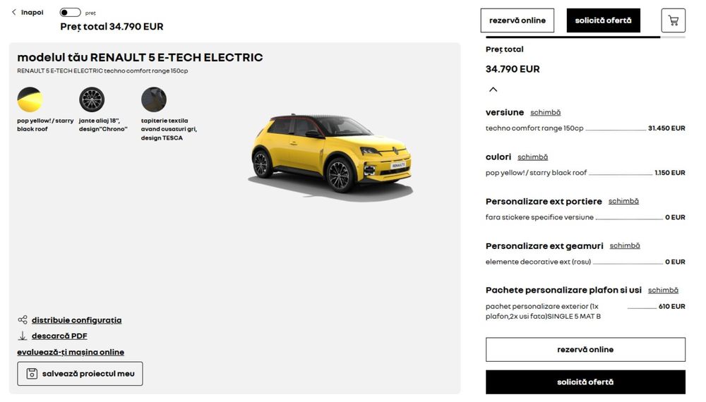 Nici nu am stat pe gânduri și am ales culoarea galbenă și cu opțiunea de a avea plafonul vopsit în negru. Asta înseamnă încă 1.150 euro în plus. De regulă, galbenul nu este preferatul meu, însă în cazul lui Renault 5 E-Tech am ales această culoare din două motive. În primul rând, pentru că scoate foarte bine în evidență design-ul retro-modern al modelului.