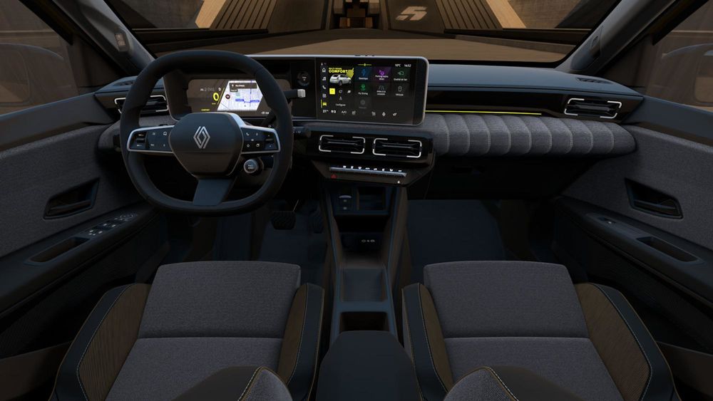 În ceea ce privește interiorul, am avut la dispoziție doar o singură tapițerie textilă, care include cusături gri și accente maro pe spătarele scaunelor. Apropo de tapițerie, aceasta este realizată exclusiv din materiale reciclate. Cu privire la tehnologie, Renault 5 E-Tech vine dotat cu un instrumentar digital de 10.25 inch și un ecran central de 10.1 inch pe care este afișat sistemul de operare OpenR Link.
