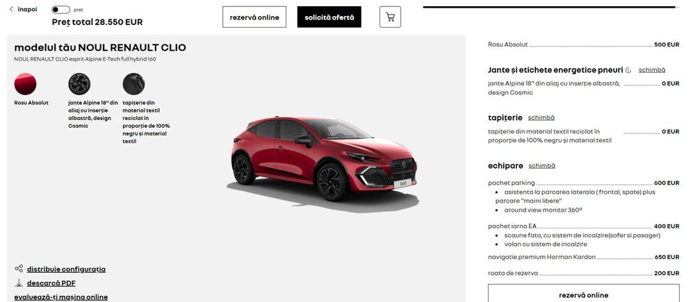 Deci, prețul final de listă, pentru acest Renault Clio cu care aș pleca acasă, este de 28.550 de euro cu TVA. Într-adevăr, n-am trecut de pragul de 30.000, dar dacă mai adaugi câteva accesorii pe care ți le oferă Renault, poți ajunge.