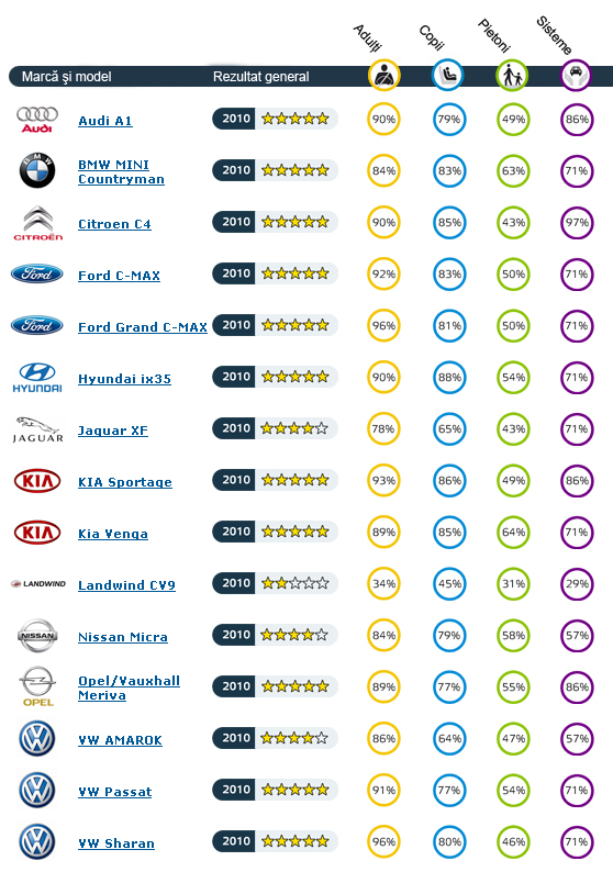 Oficialii EuroNCAP au anunţat rezultatele pentru 15 modele noi, dintre care doar 11 au obţinut cinci stele conform criteriilor introduse în 2009.Printre cele 15 modele a fost inclus şi un autovehicul din China, primul model chinezesc testat de organismul independent european. Ca de fiecare dată, această sesiune de teste a venit cu surprizele ei, manifestate prin eşecul unor modele de a obţine cinci stele EuroNCAP în condiţiile în care toată lumea se aştepta să obţină un clasament mai bun.