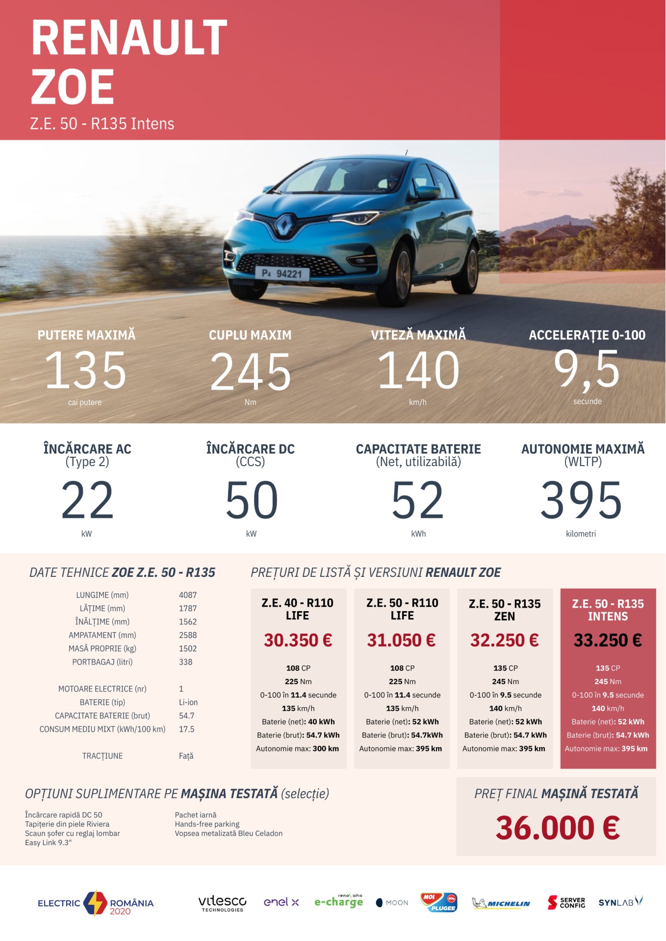 Modelul care ne va însoți în Electric România by Vitesco Technologies este un Renault Zoe ZE50 - R135 Intens în culoarea Bleu Celadon. Prețul exemplarului din tur este de 36.000 euro.