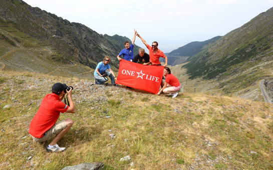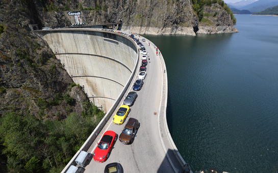 Clasica fotografie de pe barajul Vidraru. De această dată, însă, pe baraj au oprit pentru poză câteva zeci de mașini adevărate.