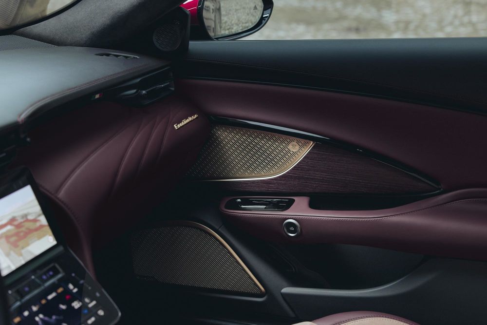 Habitaclul este îmbrăcat într-o combinație de piele naturală și Alcantara. Avem inserții în nuanța Bordeaux, accente aurii, ornamente din lemn natural și embleme speciale "Creata a Modena".
