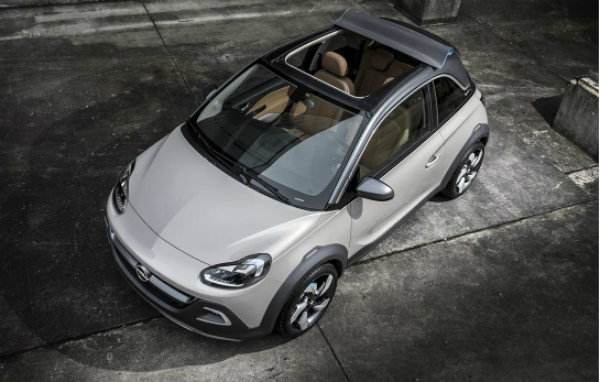 Când au prezentat conceptul Adam Rocks, cei de la Opel ne-au spus că modelul de segment A are caroseria înălțată cu 15 mm faţă de standard, respectiv cu 20 de mm mai lată, pentru a sublinia mai bine aspectul de crossover. Look-ul exterior al conceptului era completat de jante de 18 inch și de lumini LED sub formă de bumerang, inserate la nivelul proiectoarelor. În spatele jantelor colorate se ascund discuri de frână Brembo. Acoperișul rabatabil din pânză poate fi acționat din telecomandă. El se pliază până în dreptul montanților C și permite crearea senzației unui automobil cabrio, soluţie tehnică aleasă de Citroen şi de Fiat pentru versiunile decapotabile ale modelelor DS3, respectiv 500.