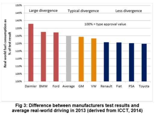Abatarea medie în industrie este de 30%, adică un consum cu până la 30% mai mare în viaţa reală faţă de valorile NEDC. Sub medie s-au clasat concernele GM, Volkswagen, Renault, Fiat, PSA şi Toyota.