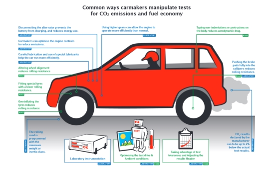 Printre trucurile folosite de unii constructori de automobile pentru a obţine o valoare cât mai bună a consumului de carburant se numără deconectarea alternatorului, oprirea tuturor consumatorilor auxiliari (aer condiţionat, radio, lumini, etc.), folosirea treptelor de viteze superioare în situaţia în care acestea nu ar fi neapărat necesare pentru a face motorul să ruleze la o turaţie mai redusă, ungererea atentă a unor componente care nu sunt unse în mod normal şi folosirea altor uleiuri faţă de maşinile standard şi chiar lipirea de bandă adezivă peste micile spaţii ale caroseriei pentru a îmbunătăţi coeficientul aerodinamic. Organismul european care a realizat acest studiu susţine că producătorii împing plăcuţele de frână în etrieri pentru a reduce rezistenţa la rulare a acestora, modifică unghiurile şi aliniamentul roţilor pentru a reduce rezistenţa la rulare, umflă pneurile la o presiune superioară celei recomandate, echipează vehiculul cu pneuri speciale cu rezistenţă la rulare mai scăzută şi chiar profită de toleranţele specifice ale testelor pentru a putea modifica ulterior rezultatele.Şapte mituri false despre cum să reduci consumul maşinii tale