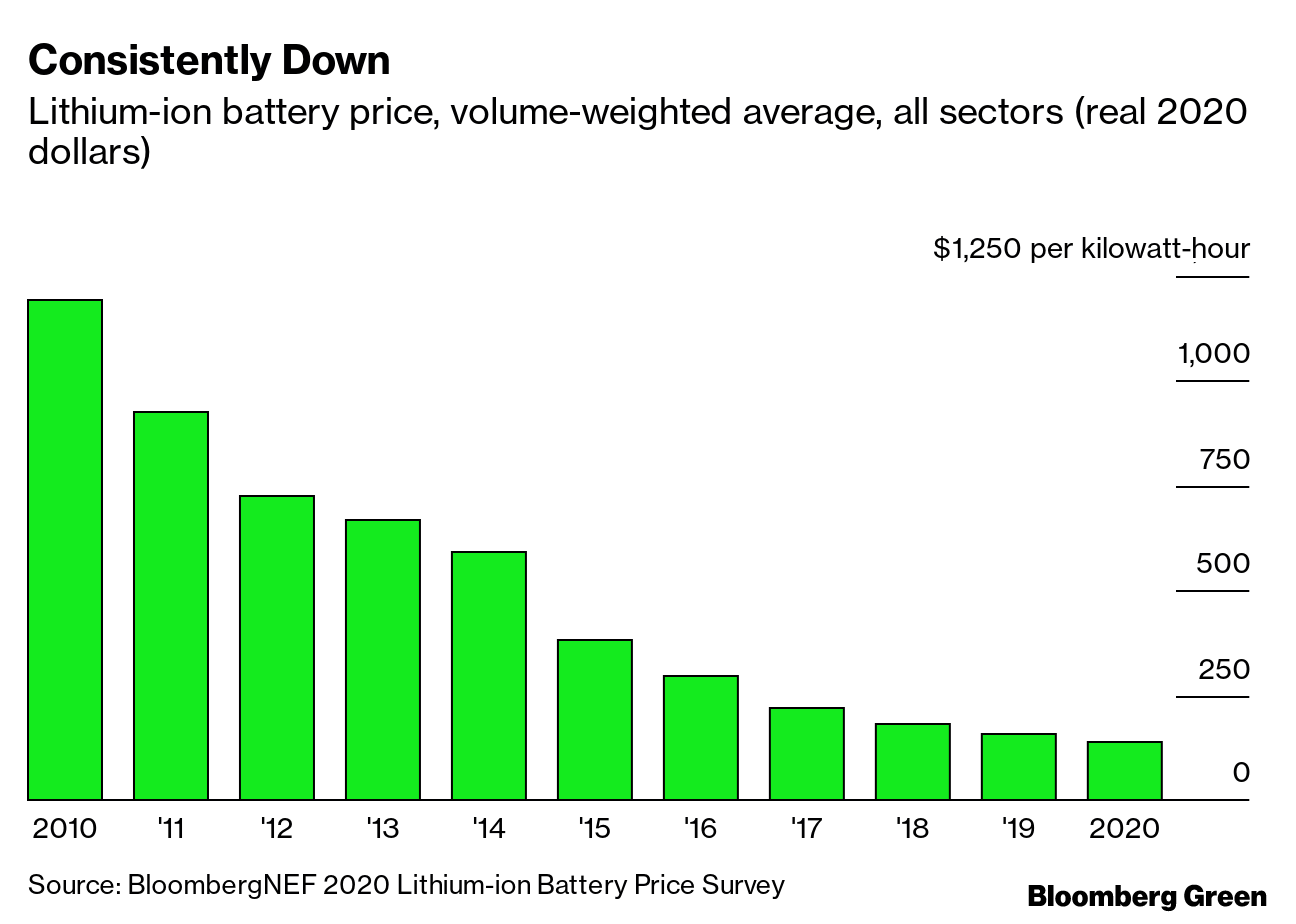BloombergNEF anticipează că în anul 2023 prețul mediu va scădea la numai 101 dolari pe kWh. Acest preț este foarte aproape de pragul de 100 de dolari pe kWh de la care se anticipează că producătorii auto vor putea oferi mașini electrice la același preț cu mașinile cu motoare convenționale și cu aceeași marjă de profit.