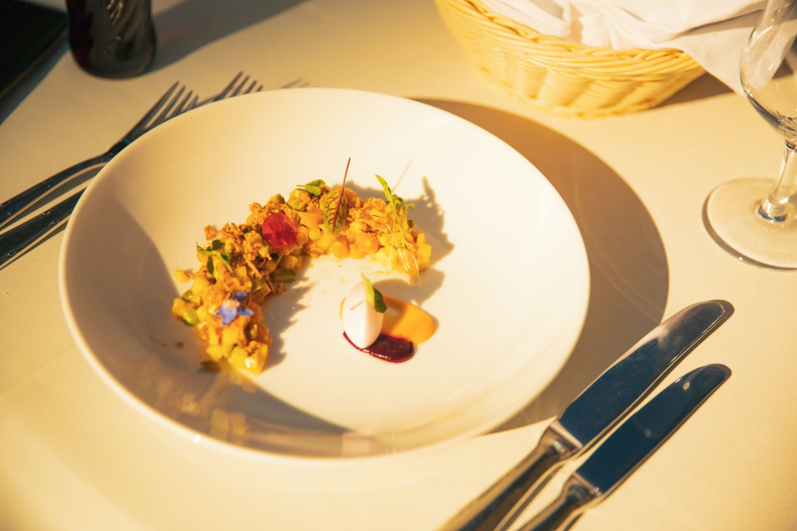 Prânzul ne-a așternut în farfurie adevărate picturi murale: un tartar de avocado și somon, o vită suculentă ornată cu ciuperci sălbatice și un strat de ciocolată rubinie peste un mousse mai dulce ca viața la Paris.