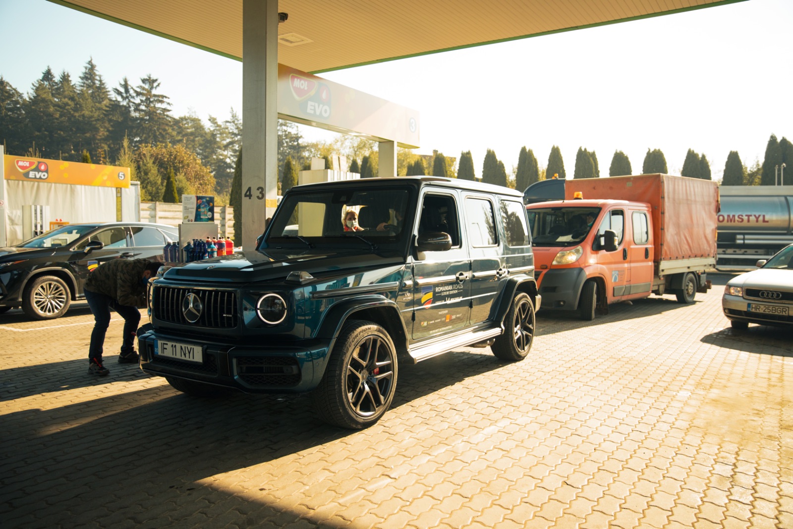 Ne-am regrupat la una dintre stațiile Mol România din Târgu Mureș cu echipajul care astăzi a condus Mercedes-AMG G63. Ne-am bucurat că de pe scaunele din spate ale modelului german au coborât și colegii care au fost implicați în accident. Am alimentat rapid, am spălat mașinile și am pornit către destinația finală: Castel Haller.