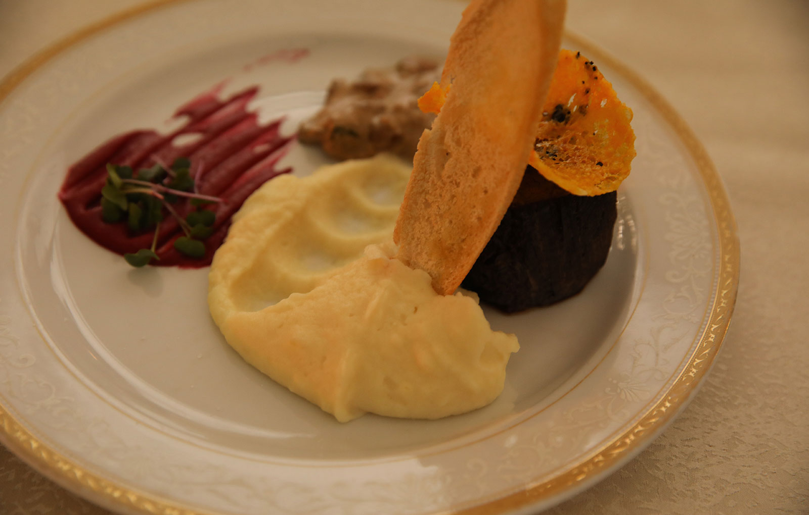 Peste toate acestea s-a adăugat un piure de sfeclă roșie și chipsuri din parmezan. Iar ca simțurile să poată fi eliberate complet, desertul ales a fost pannacotta cu înghețată și sos de ciocolată.