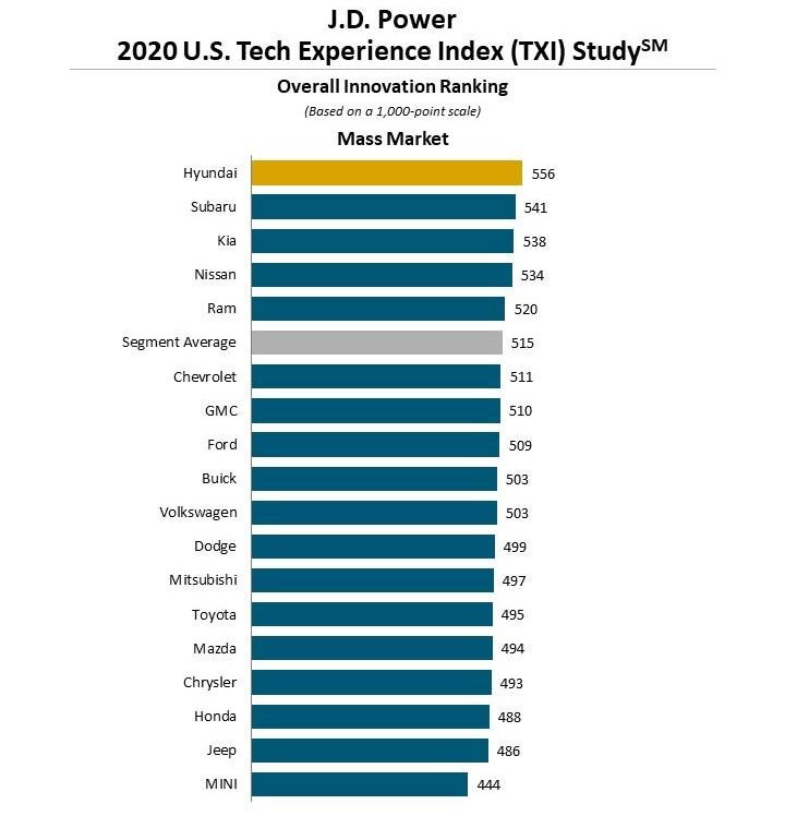 În opinia proprietarilor americani, Volvo este constructorul care adoptă cele mai multe tehnologii, cu un scor total de 617 puncte, iar următoarele locuri sunt ocupate de BMW (583), Cadillac (577), Mercedes-Benz (567) și Genesis (559).