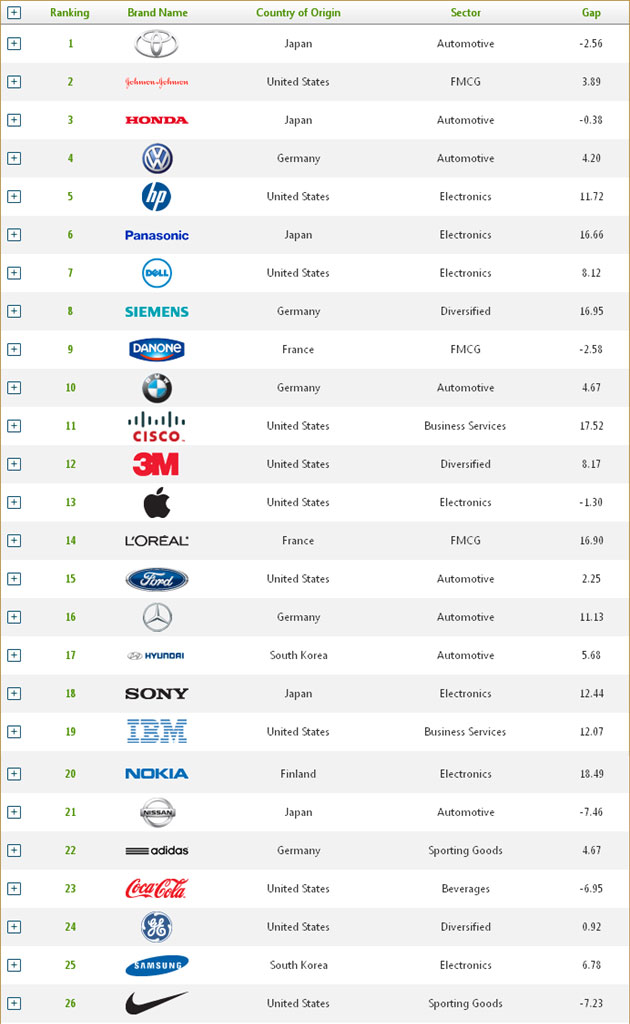 Bazându-se pe expertiza celor de la Deloitte, care au evaluat eforturile ecologice a 100 de companii globale şi modul în care au fost percepute aceste eforturi de către consumatori. Studiul a presupus interogarea unui eşantion de 10.000 de oameni. Grupurile auto şi cele care se axează pe domeniul tehnologic au dominat ”Topul celor mai ecologice branduri”.