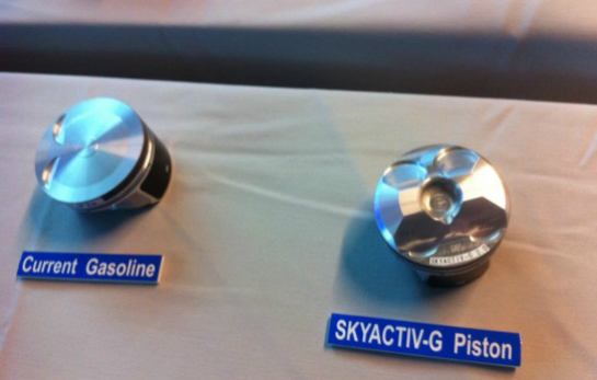 Motoarele SkyActiv-G abordează un raport de compresie neobişnuit de ridicat pentru un motor alimentat cu benzină, ceea ce necesită pistoane speciale, cu o configuraţie diferită.