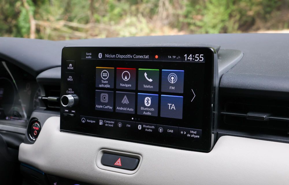 Pe consola centrală regăsim și o zonă pentru încărcat telefonul prin inducție, iar conectivitatea la Apple CarPlay și Android Auto se face fără fir și fără probleme.