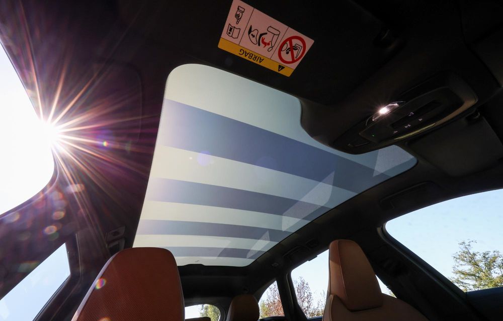 Din nou, dacă te țin buzunarele, poți opta și pentru un plafon panoramic din sticlă cu transparență reglabilă. Costă 2.715 euro, dar este spectaculos și inundă habitaclul cu lumină naturală. Ce înseamnă transparență reglabilă? Devine transparent sau opac la apăsarea unui buton. Inclusiv pe secțiuni.