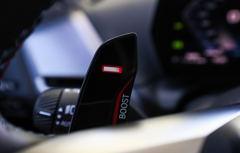 Dacă vrei ca toate sistemele relevante să treacă rapid în modul Sport, ai la dispoziție funcția Boost. Tragi de padela din stânga volanului, iar pentru următoarele 10 secunde totul (motorul, transmisia etc.) trece în modul Sport.