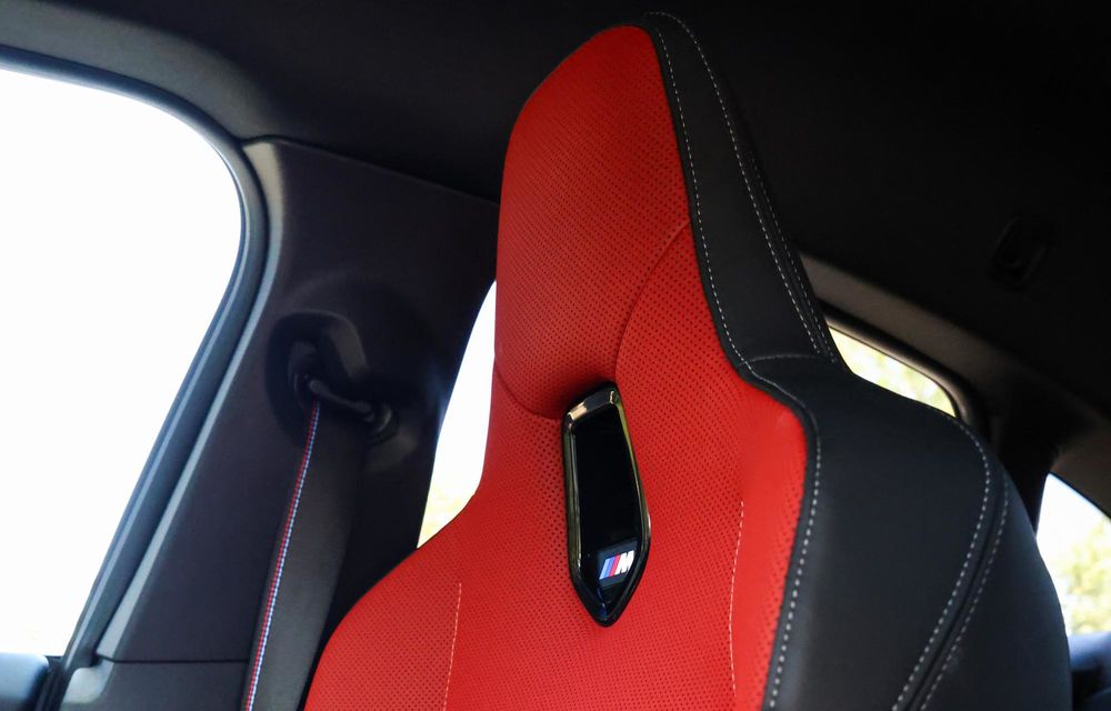 Ai aceleași linii drepte, același număr redus de butoane fizice, aceleași guri de ventilație ascunse în bord și același sistem de iluminare ambientală integrat în ornamentele interioare. Pentru că vorbim despre o versiune M235, primești un volan M, cu inserție metalică în partea inferioară, dar și scaune față sport, îmbrăcate (în cazul nostru) în piele ecologică bicoloră.