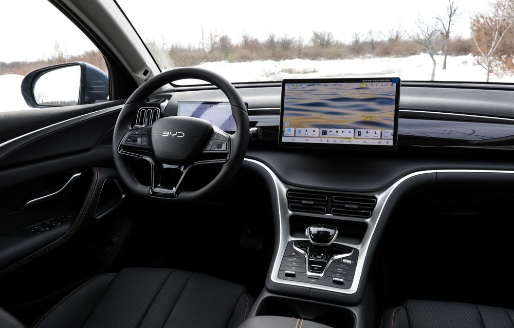 Primul lucru pe care îl vei observa atunci când te urci la volanul lui BYD Sealion 5 DM-i este poziția înaltă pe care ți-o oferă. De asemenea, vei observa și un bord cu un aspect destul de minimalist, lipsit aproape în totalitate de butoane fizice. Aceste comenzi sunt concentrate în consola centrală, în jurul selectorului transmisiei, astfel încât BYD Sealion 5 DM-i aduce, strict din acest punct de vedere, o abordare ușor mai tradițională.