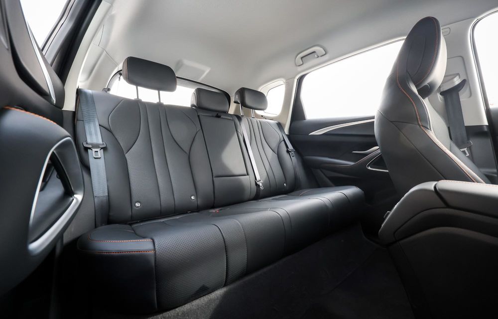 Revenind la scaune, acestea au tetiere integrate, sunt reglabile electric și au și încălzire. Totuși, scaunele lui BYD Sealion 5 DM-i nu sunt cele mai confortabile la drum lung, iar susținerea laterală putea fi ceva mai bună. În schimb, habitaclul este destul de spațios, atât în față cât și în spate. Pe banchetă pot sta lejer 3 persoane, iar spațiul la cap este suficient chiar și pentru cineva cu o înălțime de 1.88 metri, cum este cazul meu. Aici mai ai două aeratoare și două porturi USB-C, iar în mijlocul banchetei ai și o cotieră cu două suporturi de pahare.