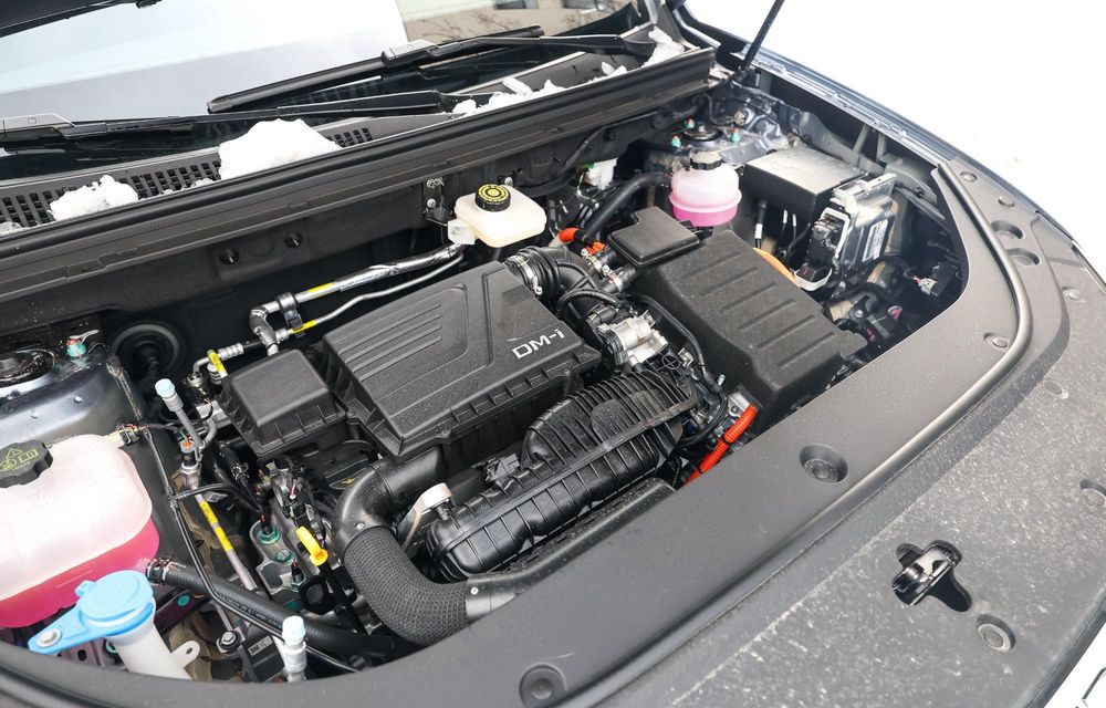 Așadar, ce se află sub capota lui BYD Sealion 5 DM-i? Pe de-o parte, ai un motor pe benzină în 4 cilindri de 1.5 litri. De cealaltă parte, ai un singur motor electric, care antrenează roțile din față. Modelul chinez dispune de 212 cai putere și un cuplu de 300 Nm.