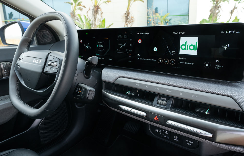 Noua Kia EV4 stă foarte bine la capitolul tehnologie. Instrumentarul de bord digital are 12.3 inch, grafica este destul de simplă (specifică Kia până la urmă), dar este ușor de citit.
