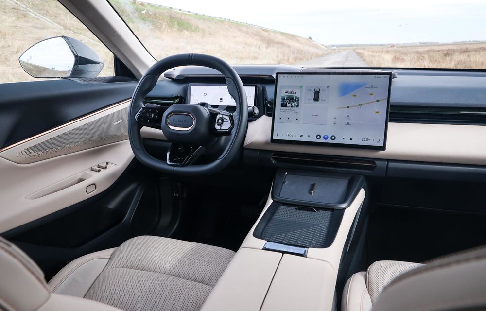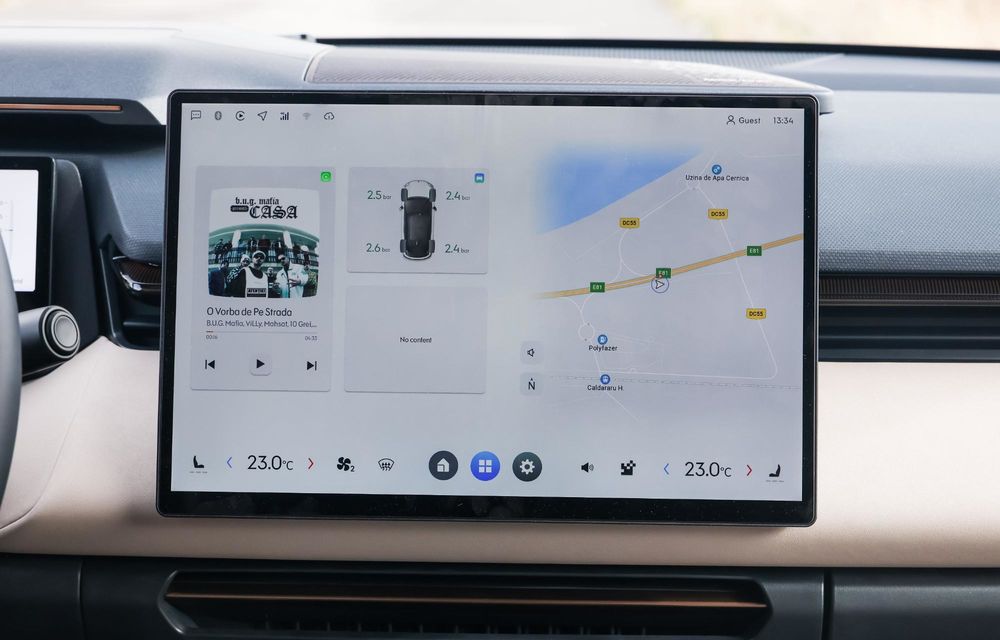 Șoferul primește un instrumentar de bord complet digital, de 10.2 inch, cu o grafică bună, dar care nu este prea configurabil. Ecranul central este imens deoarece are o diagonală de 15.4 inch. Și aici grafica este excelentă și se mișcă fără întârzieri.