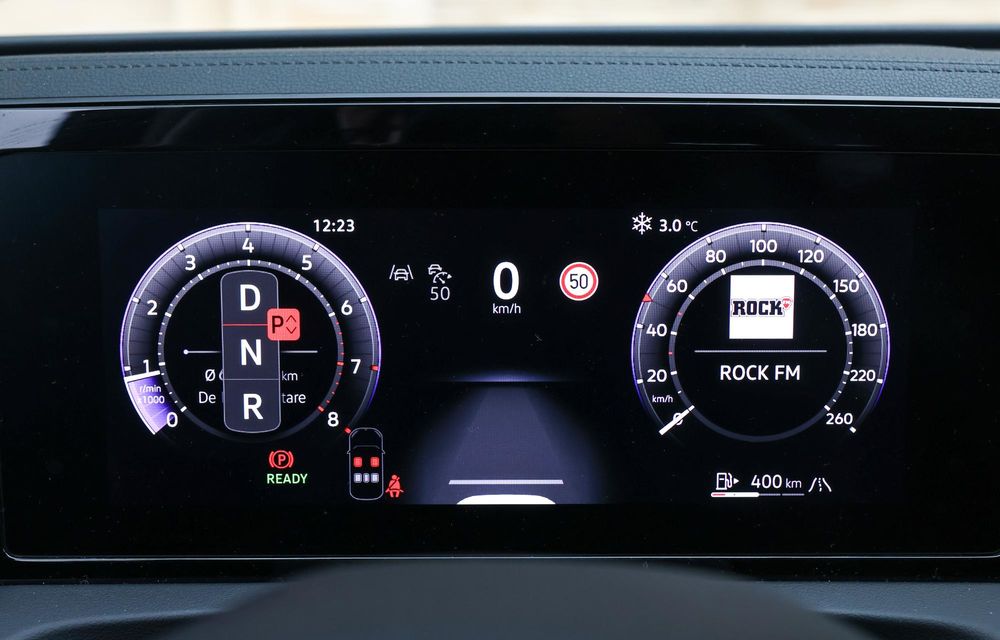 Instrumentarul digital este perfect lizibil și are diferite afișaje care pot fi selectate prin apăsarea unui buton pe volan. Poți alege un afișaj tradițional, cu turometru și vitezometru, o hartă, dacă mașina vine cu navigație din fabrică, sau un afișaj simplificat, cu turometru în mijloc.