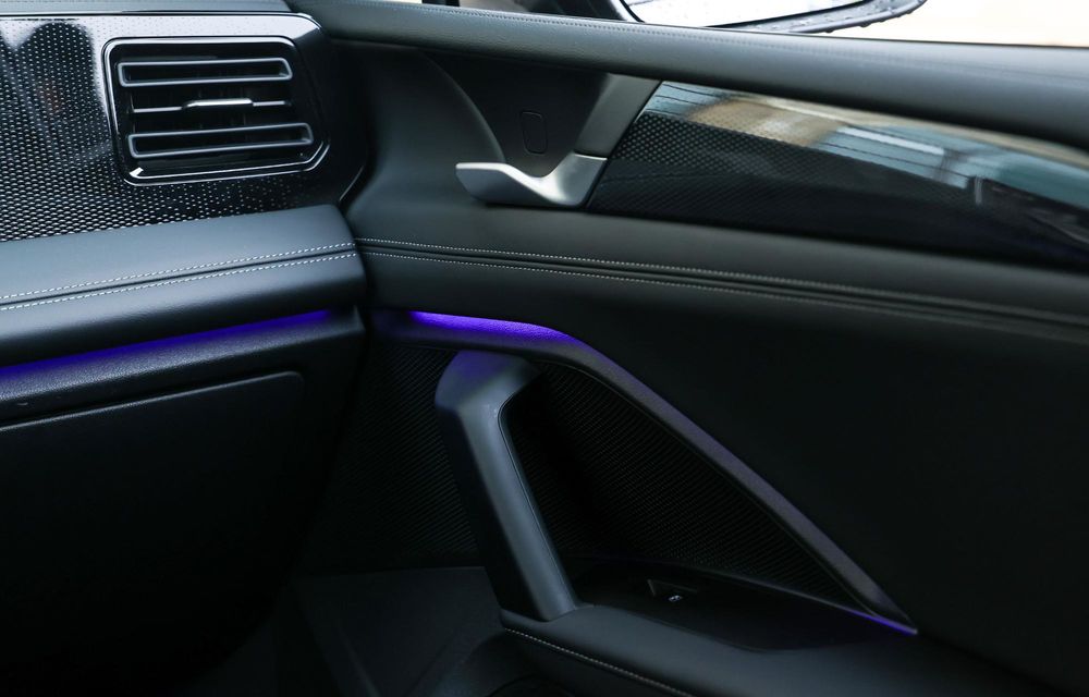Apropo, ai două porturi USB-C în consola centrală din față, ascunse sub o tavă mică pe care îți poți pune telefonul. Mașina mea nu a avut, în schimb, un sistem de încărcare prin inducție. Am avut, în schimb, iluminare ambientală, care oferă o atmosferă plăcută în habitaclu pe timp de noapte.