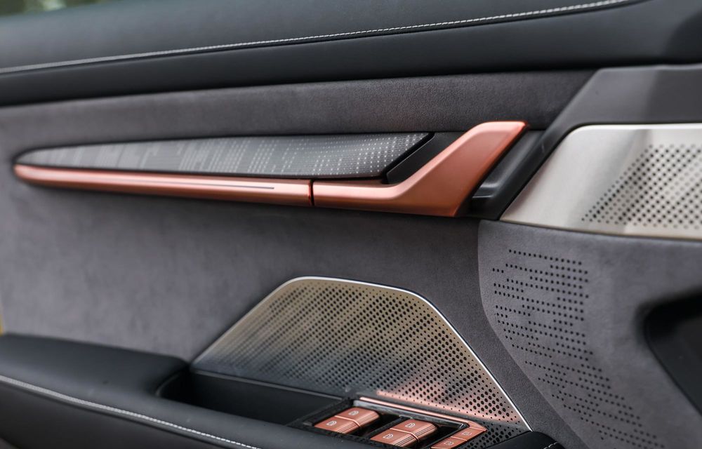 Plafonul este îmbrăcat în Alcantara, luminile ambientale sunt integrate elegant în diverse suprafețe de pe bord și portiere, butoanele prin care operezi geamurile electrice sunt finisate în Rose Gold, cotiera este dublă și încăpătoare, iar buzunarele portierelor sunt, fără să exagerez cu nimic, singurele zone unde regăsești plastic dur.